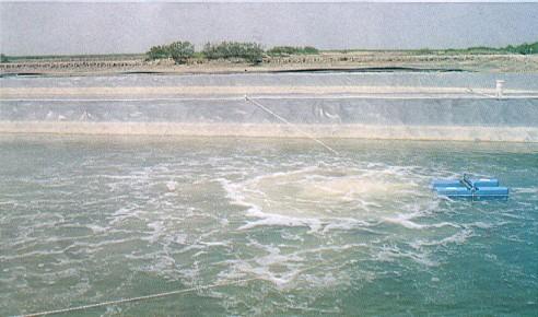正常工作時(shí),水花大面積擴(kuò)散到水面,微氣泡中的氧在上升過程中繼續(xù)向液相傳遞,以實(shí)現(xiàn)二次溶解氧的產(chǎn)生,提高曝氣效果;同時(shí),水和氣體在整個(gè)曝氣池內(nèi)形成較大的上下循環(huán),使池底的污泥經(jīng)常處于翻轉(zhuǎn)懸浮狀態(tài),增加了接觸面積,消除了曝氣池中的死角。