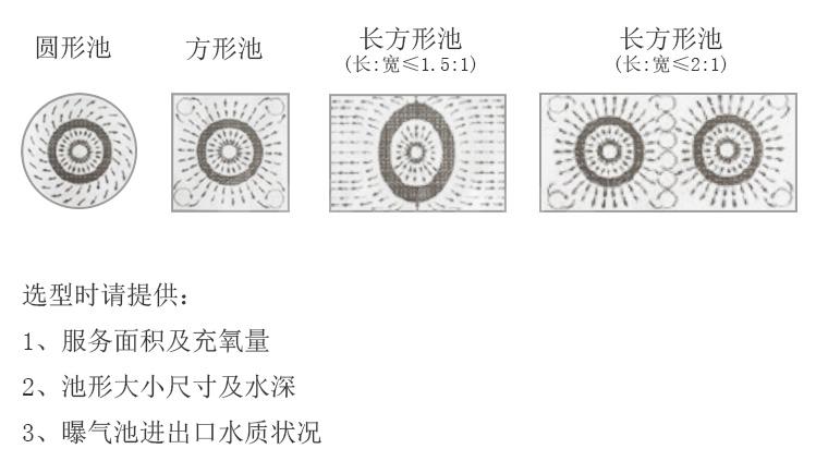 進(jìn)氣管上端為空氣吸入口,位于水面之上,下端與混合室聯(lián)通,接通電源后由于葉輪旋轉(zhuǎn),高速水流從葉輪出口流出,經(jīng)混合室形成負(fù)壓,因而空氣被吸入并與污水混合,混合液從出口流出,完成對污水的充氧。