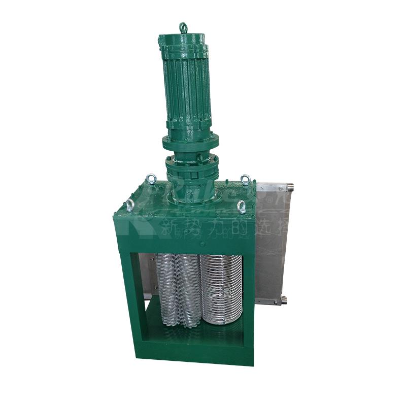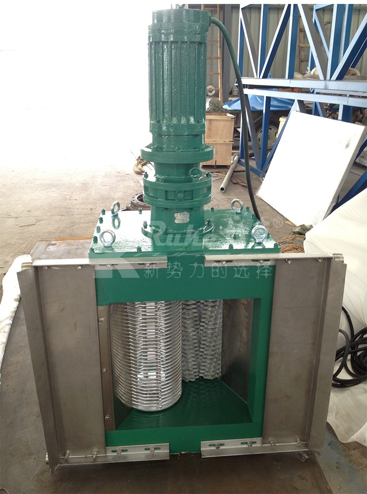 在驅動部件帶動下,轉鼓格柵的齒耙作圓周運動,將被圓形柵條截留的水中雜物,送至破碎機,而水從格柵中流過。破碎機驅動部件帶動主動軸轉動,同時主動軸通過精密齒輪帶動從動軸轉動,使固定于兩軸上的銑刀呈逆向旋轉,而將固體物咬擠破碎。