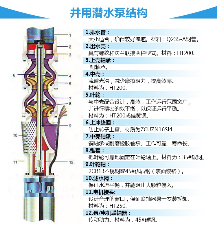 QRJ 型井用潛水泵是通過水力模型和結(jié)構(gòu)設(shè)計的產(chǎn)品,采用多項(xiàng)工藝,完 全按照水力協(xié)會標(biāo)準(zhǔn)生產(chǎn)制造,全系列井用潛水泵被均為節(jié)能型產(chǎn)品。