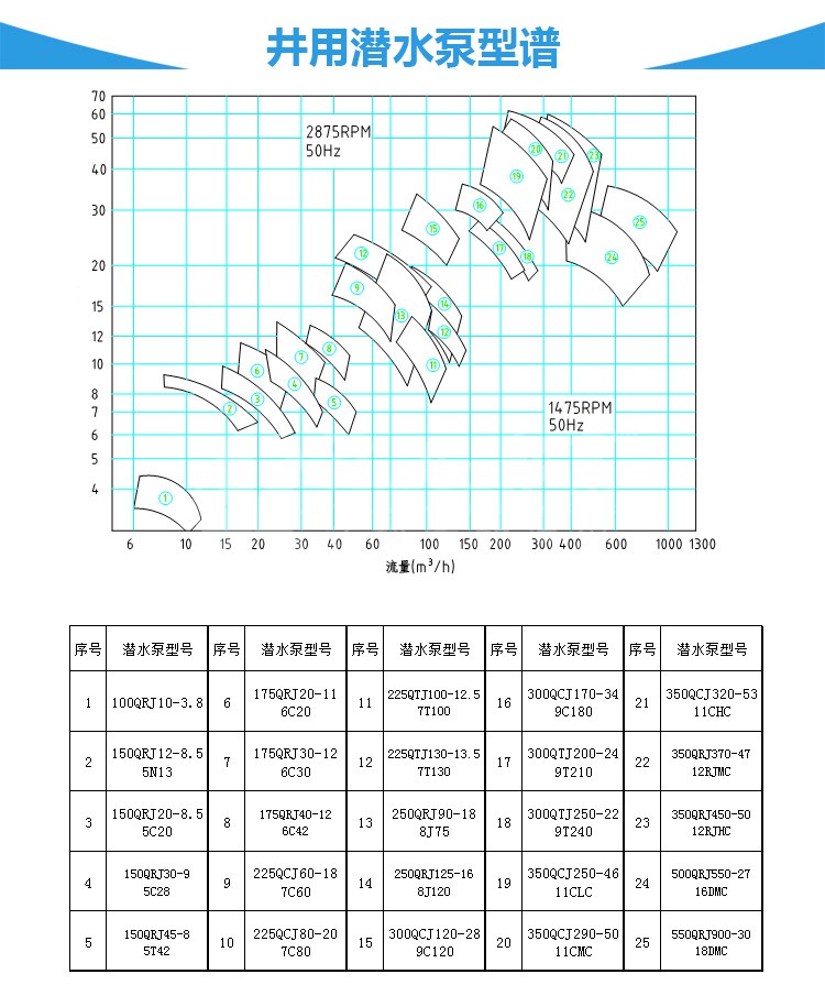 QRJ 型井用潛水泵是通過水力模型和結(jié)構(gòu)設(shè)計的產(chǎn)品,采用多項(xiàng)工藝,完 全按照水力協(xié)會標(biāo)準(zhǔn)生產(chǎn)制造,全系列井用潛水泵被均為節(jié)能型產(chǎn)品。 性能范圍: Q2200m/h,H420m,抽送清水或物
