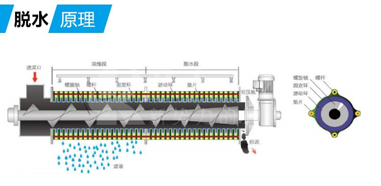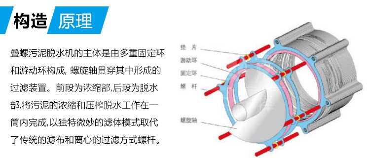 疊螺污泥脫水機(jī)是運(yùn)用了螺杄擠壓原理,通過螺杄直徑和螺距變化產(chǎn)生的強(qiáng)大擠壓力,以及游動(dòng)環(huán)和固定環(huán)之間的微小縫隙,實(shí)現(xiàn)對(duì)污泥進(jìn)行擠壓脫水的一種新型固液分離設(shè)備。