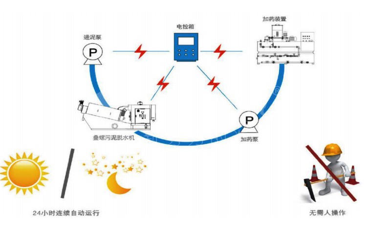 疊螺污泥脫水機(jī)從泵送污泥,加入藥液,排出泥餅均采用自動(dòng)控制,通過電控柜,加藥裝置,進(jìn)泥泵,加藥泵等進(jìn)行聯(lián)動(dòng),不需人員操作設(shè)備,運(yùn)行不會(huì)發(fā)生堵塞、濾帶走偏或其他影響工藝安全的現(xiàn)象,日常保養(yǎng)維護(hù)簡(jiǎn)更,可以 24 小時(shí)無人連續(xù)運(yùn)行。第一次真正意義上實(shí)現(xiàn)了污泥脫水連續(xù)全自動(dòng)運(yùn)行。